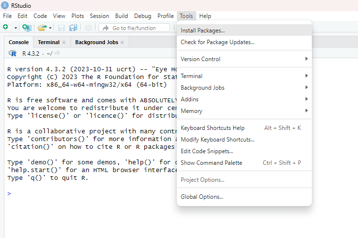 There is a whole separate list of all packages you might need throughout your data analytics journey, and I have published it separately on this website. These, and other packages you might need, you can easily install by opening your R Studio, and pressing Tools – Install packages, as shown in the picture below.