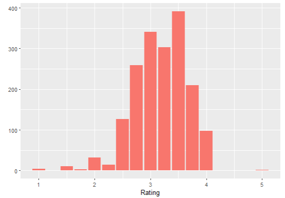 With this code, I have essentially checked which rating is lower than our lower whisker (2.25) and which rating is higher than our upper whisker (4.125), as those would be outliers. Our presumption would be, hopefully, we don’t have a lot of those values and our distribution will be too skewed. Again, in this dataset, we have a total of 1.795 observations, so we have around 2.8% of values that are considered outliers, which is not too many. In the end, true outliers would lie below and above 3 * IQR, as that is truly very far away from the usual values in a dataset.