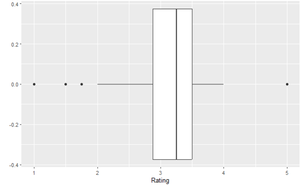 Boxplot is the one graph we use to depict the numbers in the table under. Boxplot is a graph in the form of a box, and it puts quartiles and mean values onto it, creating a new perspective. It also takes outliers into account and shows them as well. The rating variable in this dataset can easily be shown with this simple boxplot: