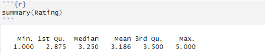 Once again, measures of central tendency are mean, median, and mode. Mode is almost impossible to compute for quantitative data because mode represents the value that has the highest number of occurrences in a dataset for a variable. If you have decimal numbers, it is very hard to find one single value that is repeating itself throughout the data set. We can compute a summary for the Rating of the chocolate bars and check the numbers acquainted with that variable.