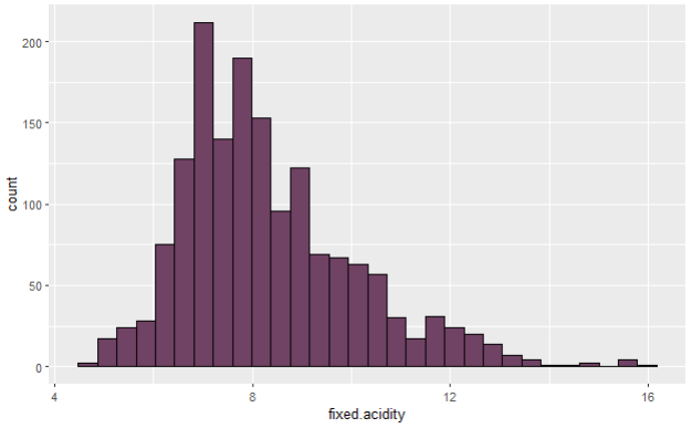 ggplot(data,aes(x=fixed.acidity)) + geom_histogram(fill="#704264",colour="black")