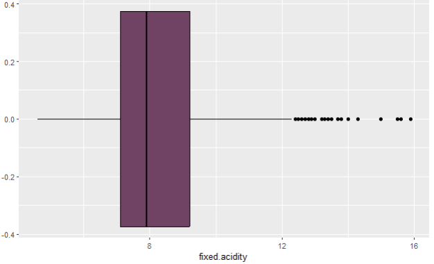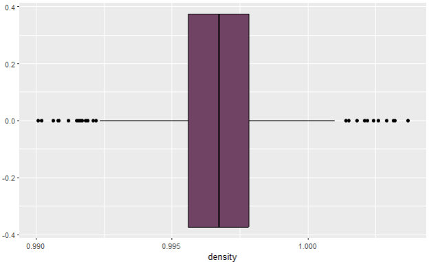 When it comes to skewness, we are always looking at mean and median values. If the mean is higher than median, then the distribution of the variable is skewed to the right (meaning that the lower values are higher in number than higher values) and vice versa. Looking solely at the numerical, summary part, we can see that the variable fixed acidity is skewed to the right, and there is a lot of lower values, much more than higher values, and in this case those higher values might be considered outliers. On photo 2 for the density variable, you can see that almost all values are very close together, and nothing points out to be an outlier. Let’s confirm our suspicions with graphics, by using ggplot2 package in R.